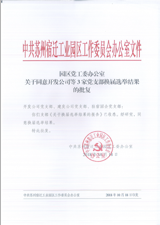 園區(qū)黨工委辦公室 關(guān)于同意開發(fā)公司等3家黨支部換屆選舉結(jié)果的批復