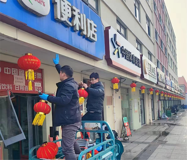 物業(yè)管理部工作人員扛上梯子,拿著燈籠,為沿街商鋪門前掛上了一個個大紅燈籠,將我們商業(yè)區(qū)裝點的漂漂亮亮。過年掛燈籠是中國傳統(tǒng)習(xí)俗,紅色代表喜慶,圓形燈籠則寓意團(tuán)圓美滿,紅燈籠象征著平安祥和和紅紅火火。建發(fā)公司希望商鋪們?nèi)兆舆^的紅紅火火,過一個平安祥和幸福年。