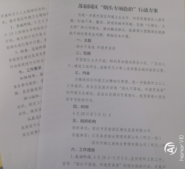 為了確保“煙頭專(zhuān)項(xiàng)撿拾”行動(dòng)順利開(kāi)展,公司結(jié)合園區(qū)實(shí)際,精心籌劃,制定了《蘇宿園區(qū)“煙頭專(zhuān)項(xiàng)撿拾”行動(dòng)方案》。